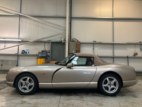 1999 T Reg TVR Chimaera 4000cc – FOR SALE @ £18750 Wild Oyster Pearl, Fawn Hide, Power Steering, 99 Model Year Camshaft update in 2024, Outriggers @ 64K, new clutch 69K, new carpets 2019, new roof 2018, well loved example, wood dashboard, upgraded audio and speakers, union jack bonnet badge, vertical opening boot, latest wiper system, latest fuel tank and filler, 72950 miles , comes serviced and 12 months MOT