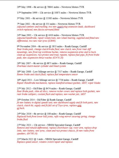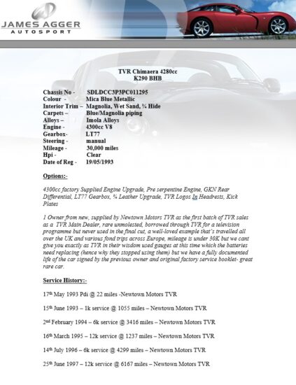 Wild Oyster fest! – 1999 T Reg TVR Chimaera 4000cc – Just come into stock, Nice to see the old girls from Melton Mowbray back together on the prowl. This is the sister car to T302 AJF we have just completed a restoration on last week (with the lighter roof) 1999 TMS Performance Vehicles, Melton Mowbray mahooosive This ones (T306 AJF…with the darker roof) is going through the workshop this coming week, has 56382 miles, had full length outriggers changed at 36315 miles, painted front at 49127 miles and a nice bunch of receipts for work carried out. The last owners have written a lovely letter to go with the car for the next keeper