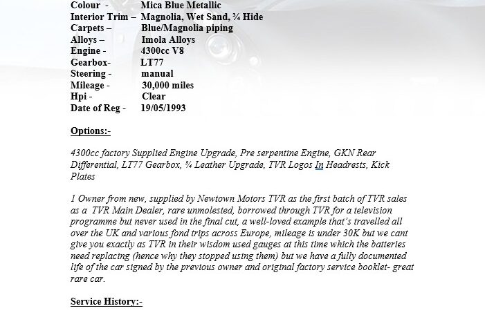 1 Owner from new, supplied by Newtown Motors TVR as the first batch of TVR sales as a TVR Main Dealer, rare unmolested, borrowed through TVR for a television programme but never used in the final cut, a well-loved example that’s travelled all over the UK and various fond trips across Europe, mileage is under 30K but we cant give you exactly as TVR in their wisdom used gauges at this time which the batteries need replacing (hence why they stopped using them) but we have a fully documented life of the car signed by the previous owner and original factory service booklet- great rare car.