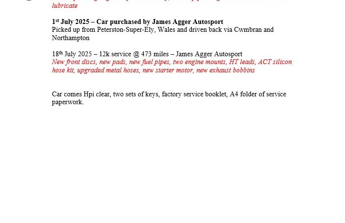 New front discs, new pads, new fuel pipes, two engine mounts, HT leads, ACT silicon hose kit, upgraded metal hoses, new starter motor, new exhaust bobbinsCar comes Hpi clear, two sets of keys, factory service booklet, A4 folder of service paperwork.
