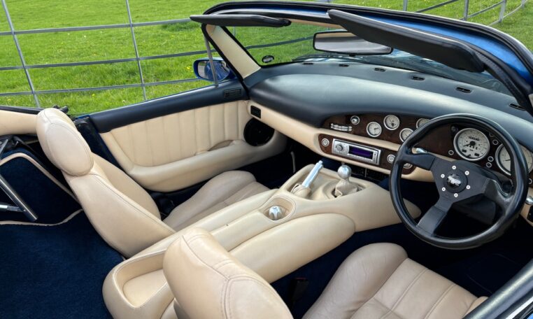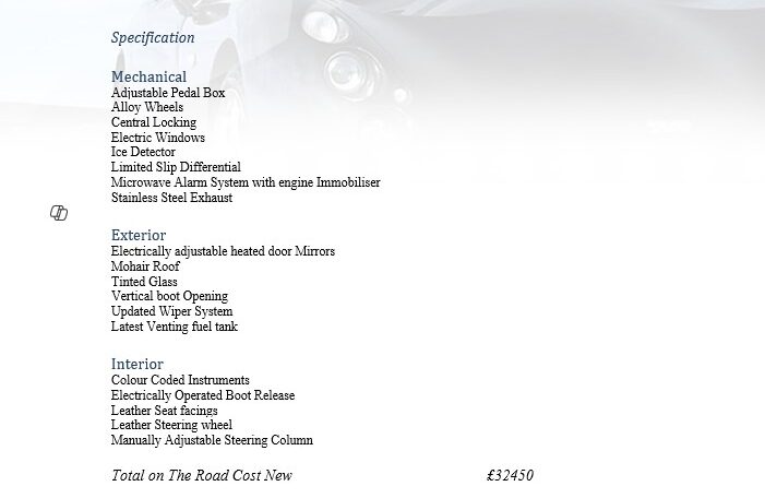 Olympic Blue, Magnolia Hide, 99 Model Year, Vertical boot opening, latest wiper system, Angled rear number plates, latest rear lights, serpentine engine, Power Steering, Upgraded Door Cards, Imola Anthracite Alloys, GAZ suspension, Leven Rear Badge, Cockpit Alloy Kit, Kick Plates, Blue Mohair roof, Wooden dashboard, Updated Outriggers @ 42600 miles, Dinatroled Chassis, New Clutch/Slave Cylinder @ 61269 miles, ACT Silicon Hose Kit, Stainless ACT Water Pipes, Upgraded Alarm remotes, 25 service stamps, sold previously by ourselves and sold and serviced since 2011,