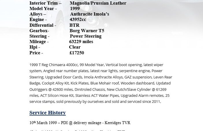 1999 T Reg Chimaera 4000cc, 99 Model Year, Vertical boot opening, latest wiper system, Angled rear number plates, latest rear lights, serpentine engine, Power Steering, Upgraded Door Cards, Imola Anthracite Alloys, GAZ suspension, Leven Rear Badge, Cockpit Alloy Kit, Kick Plates, Blue Mohair roof, Wooden dashboard, Updated Outriggers @ 42600 miles, Dinitroled Chassis, New Clutch/Slave Cylinder @ 61269 miles, ACT Silicon Hose Kit, Stainless ACT Water Pipes, Upgraded Alarm remotes, 25 service stamps, sold previously by ourselves and sold and serviced since 2011,