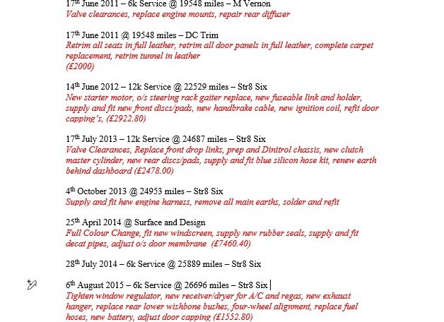 Red Bull Blue, Air Conditioning, Full leather with upgraded quilted inserts and door cards, Painted cam cover and insert, silicon coolant hose kit, Factory Sun visors, Luggage Cover, Rear Speakers, Kick Plates, Momo Trek R Steering wheel, Sports Exhaust System, Nitron Upgraded Adjustable Suspension, Carbon Fibre pedal box cover, alloy rear window handle, Alpine stereo, Full-Service History, Waxoyled Chassis, Private plate T13 SOC included, extensive service history