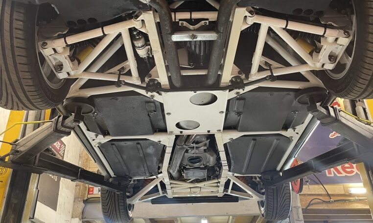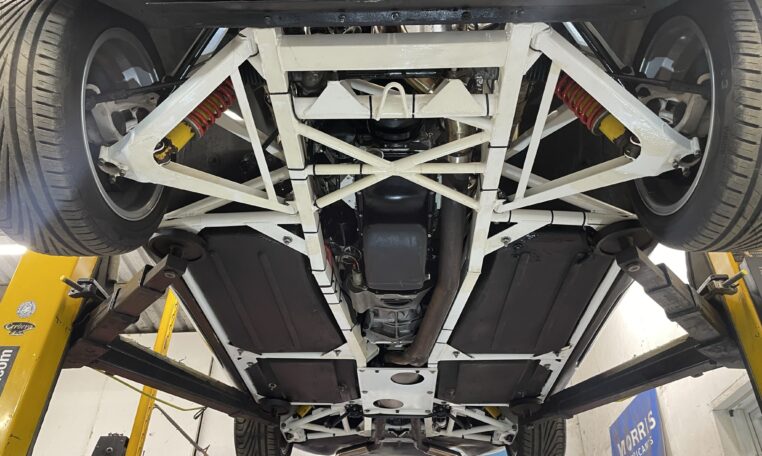 Chassis stripped, new outriggers fitted/welded on by RT racing Sheffield (who have the original factory jigs), chassis and wishbones were then blasted, hot zinc coated and re powder coated factory white.