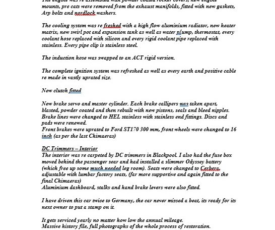 Front brakes were uprated to Ford ST170 300 mm, front wheels were changed to 16 inch (as per the last Chimaeras)