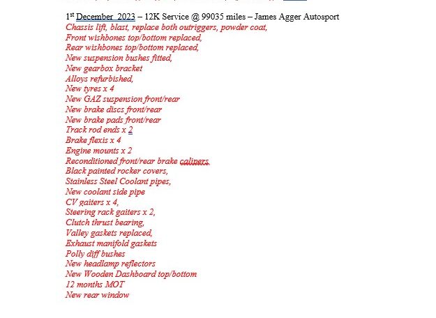 Chassis lift, blast, replace both outriggers, powder coat, Front wishbones top/bottom replaced, Rear wishbones top/bottom replaced, New suspension bushes fitted, New gearbox bracket, Alloys refurbished, New tyres x 4, New GAZ suspension front/rear, New brake discs front/rear, New brake pads front/rear, Track rod ends x 2, Brake flexis x 4, Engine mounts x 2, Reconditioned front/rear brake callipers, Black painted rocker covers, Stainless Steel Coolant pipes, New coolant side pipe, CV gaiters x 4, Steering rack gaiters x 2, Clutch thrust bearing, Valley gaskets replaced, Exhaust manifold gaskets, Polly diff bushes, New Wood Dashboard top/bottom, 12 months MOT, New rear window
