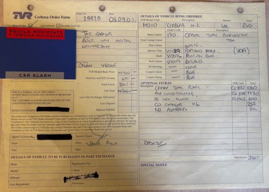 Not sure James Agger’s handwriting has improved much in 24 years looking at the new vehicle order form on this car from September 2001