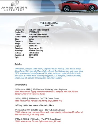 1998 S Reg TVR Griffith 5000cc landed – history listed below
