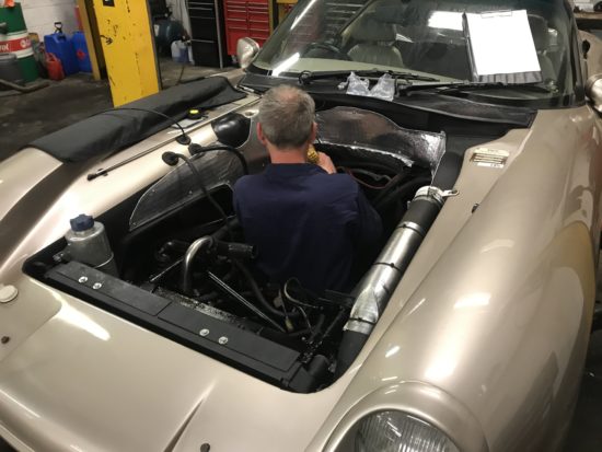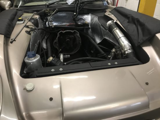 Engine came out, Martyn seen titivating the area, together with preparation, re heat proofing the engine bay and making sure the engine was all tip top, together with some beautifully made stainless steel manifolds and Y piece we have fitted.
